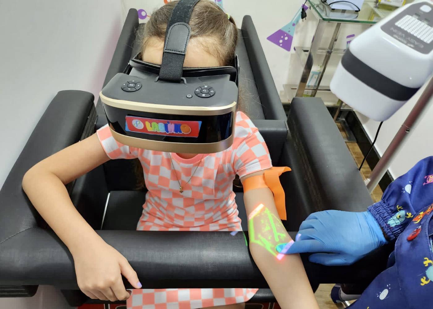 - Óculos de realidade virtual, utilizado para entreter as crianças e proporcionar uma coleta mais lúdica, agradável e menos invasiva;